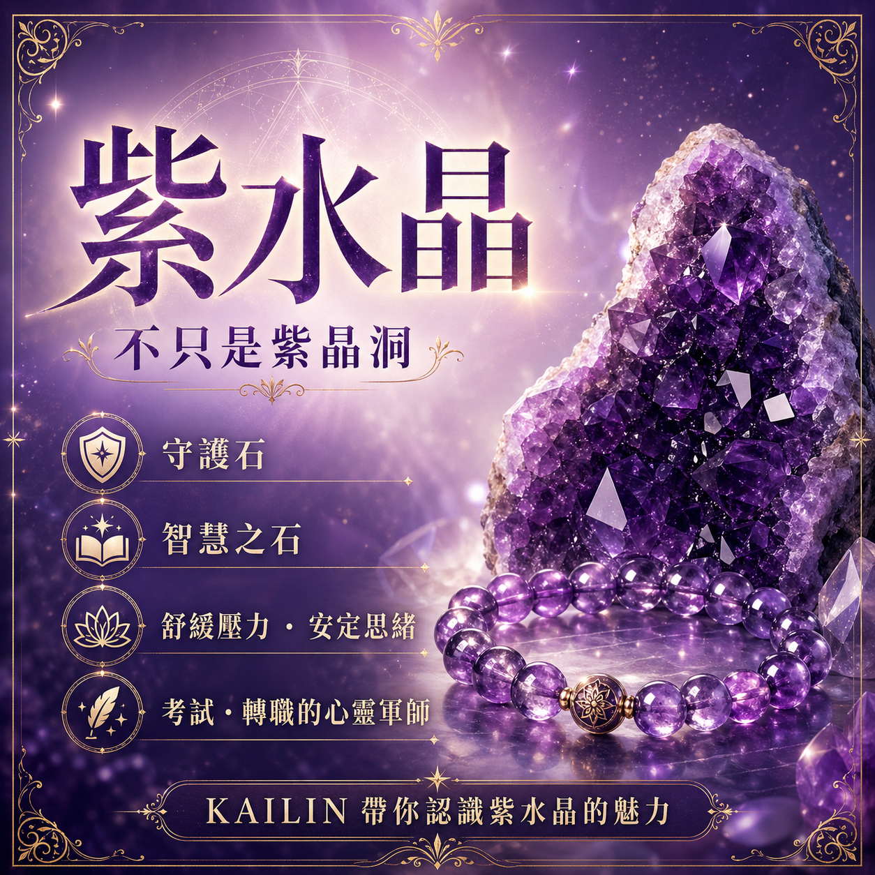 紫水晶的能量不屬於衝鋒陷陣型,它更像是一位充滿智慧的老友,在你混亂時拉你一把:
