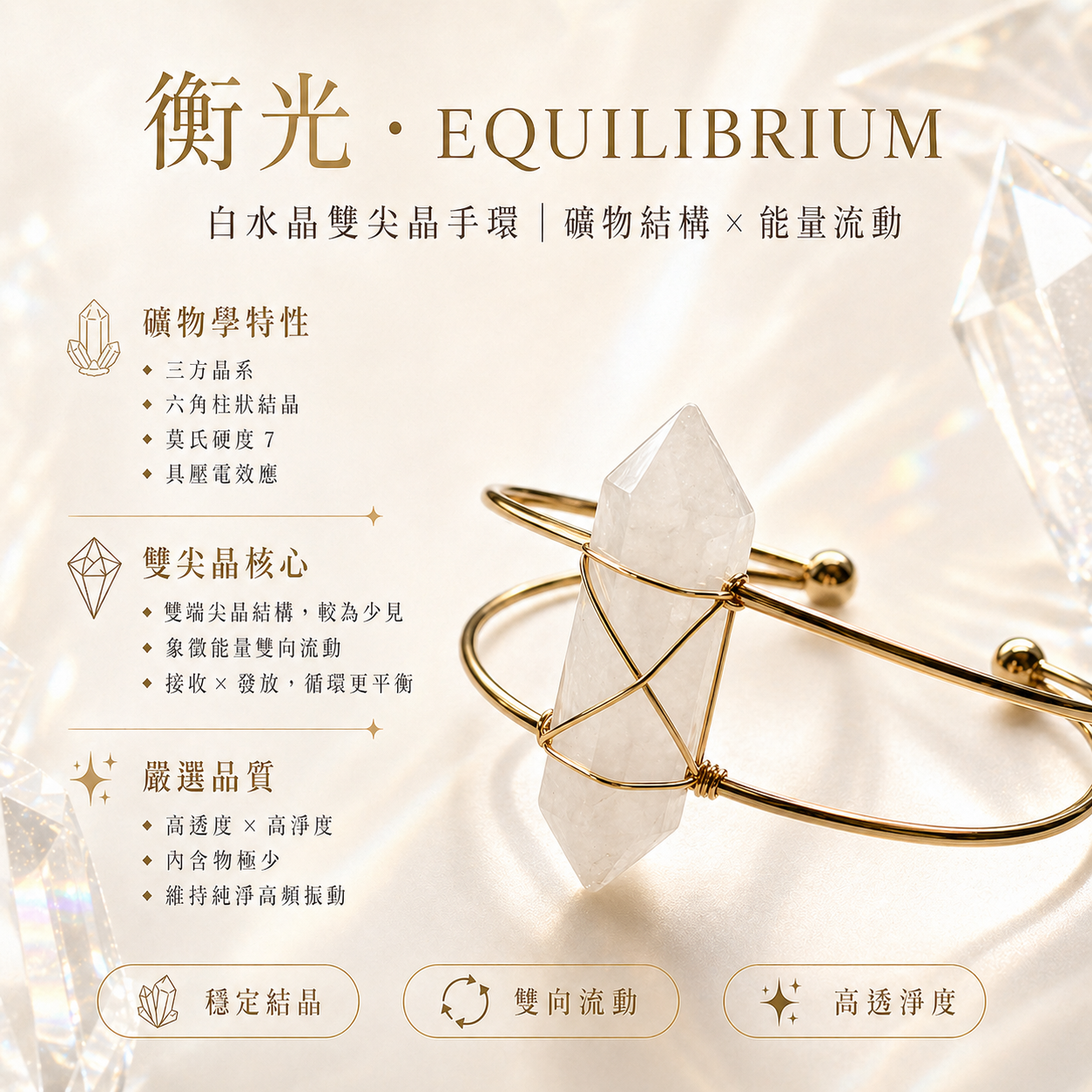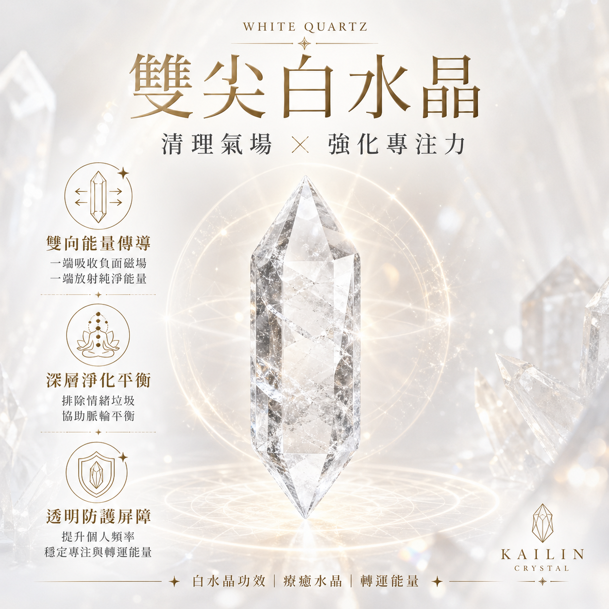 雙尖白水晶具備獨特的能量雙向傳導特性,能一端吸收負面磁場進行轉化,另一端則同步放射純淨能量,有效協助配戴者快速排除情緒垃圾並達成深層的脈輪平衡。
