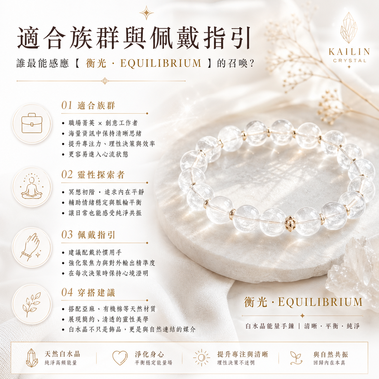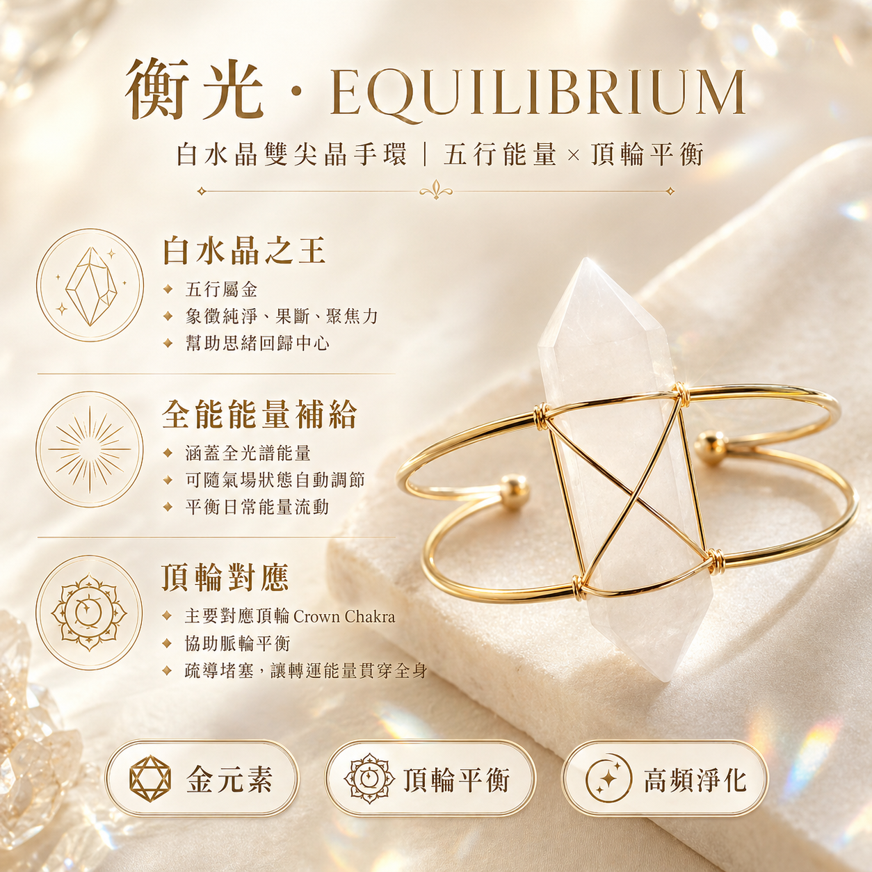 從五行能量的角度來看,白水晶具備最強大的「金」元素屬性,象徵著果斷、純淨與高度的聚焦力。