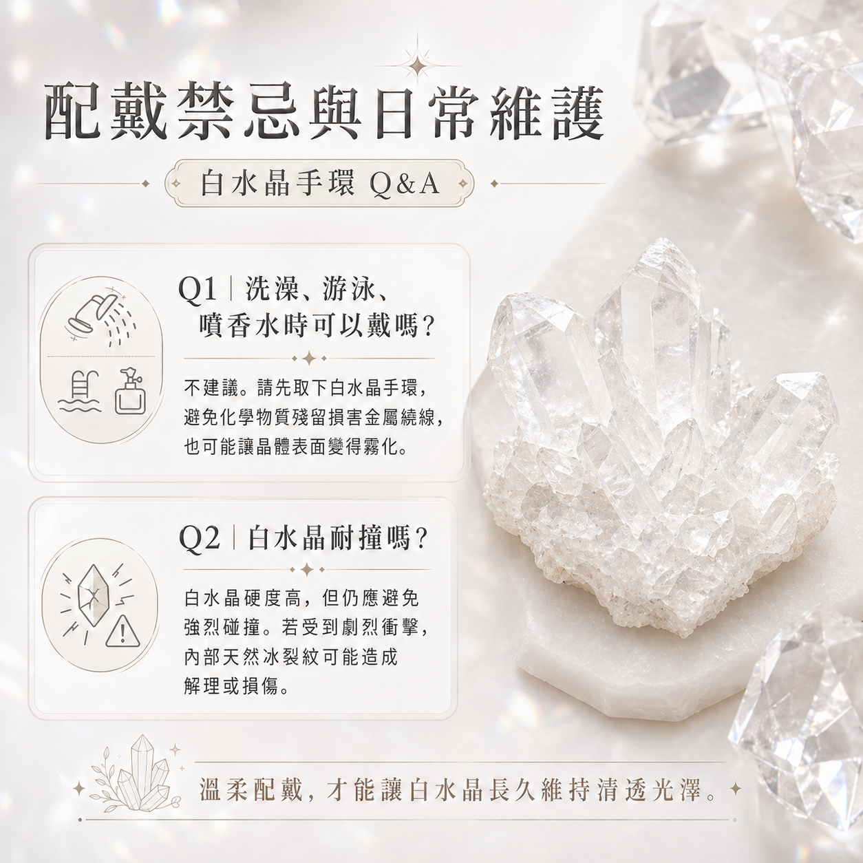 遠離化學物質:洗澡、游泳或使用濃烈香水時,請務必暫時取下白水晶手環。化學殘留會損害白水晶的金屬繞線,並可能使晶體表面變得霧化。