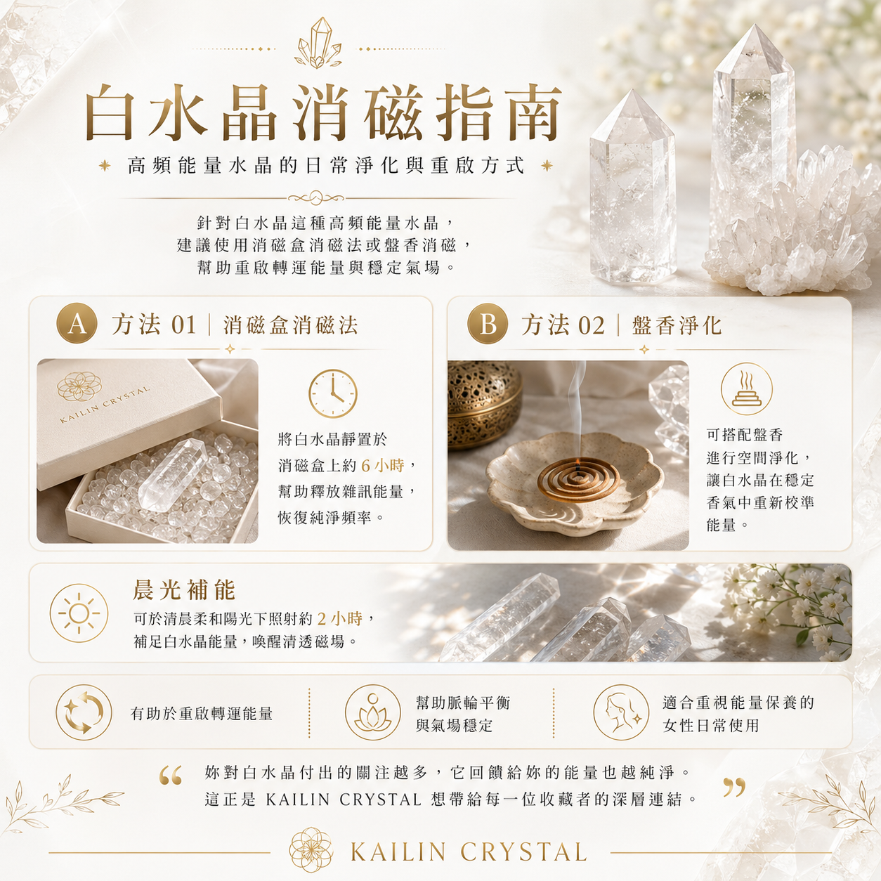 身為「水晶之王」,白水晶雖然具備強大的自我淨化能力,但適度的保養與消磁能讓它的能量更加鮮活。KAILIN CRYSTAL 建議每一位擁有【 衡光 】的朋友,都要像對待精緻珠寶一樣呵護這顆白水晶。