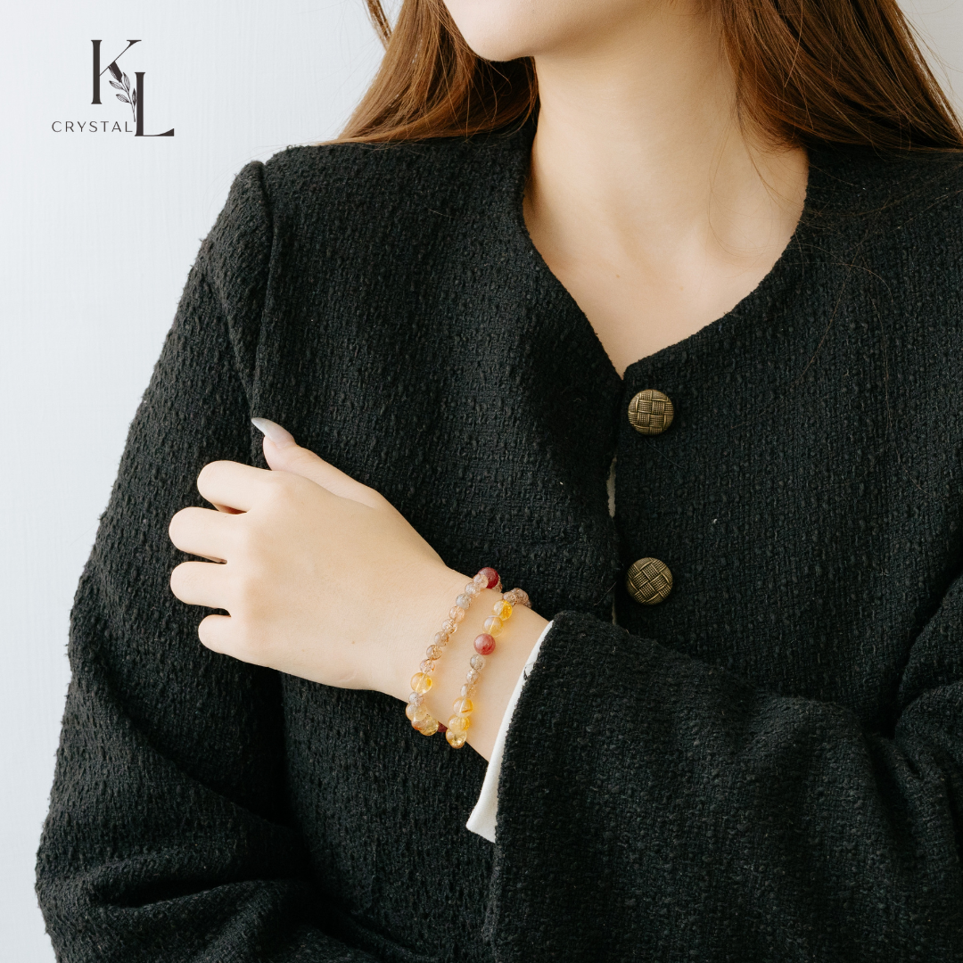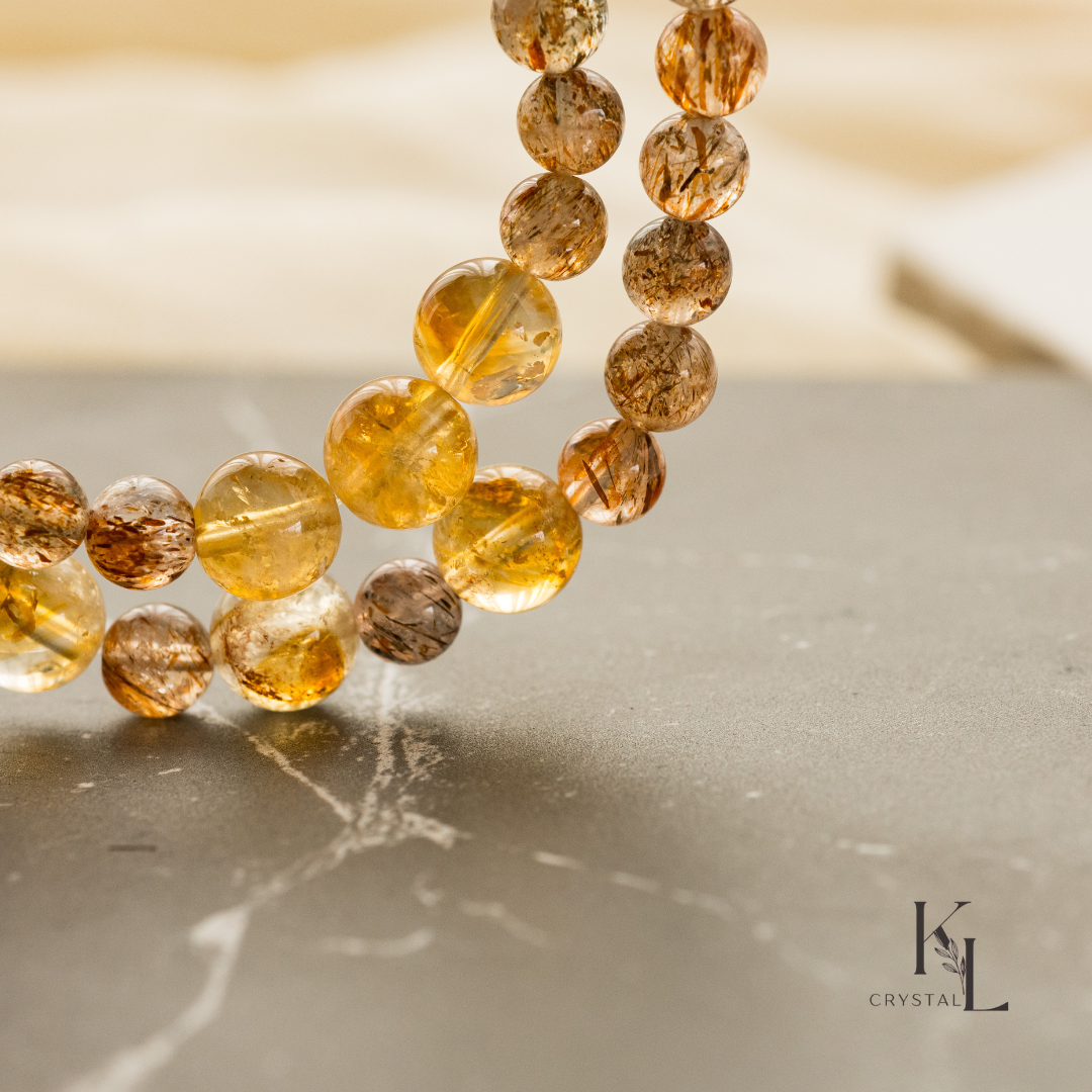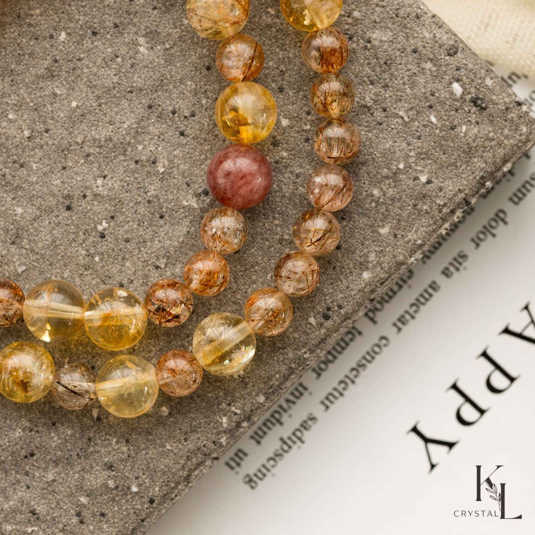 這條黑金超、黃塔晶與星空草莓晶組成的雙圈手鍊,在妳舉手投足間會散發出明確的「結果導向」氣勢,