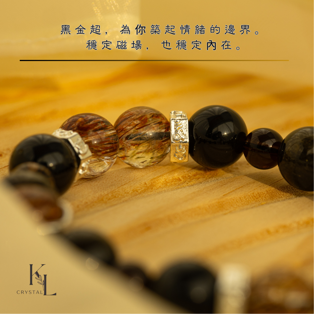 在這條手鍊中,中央鑲嵌黑金超七為核心,四顆對稱排列,如同夜空中的結界,守護你的精神堡壘,讓你在混亂之中仍保有堅定的方向。