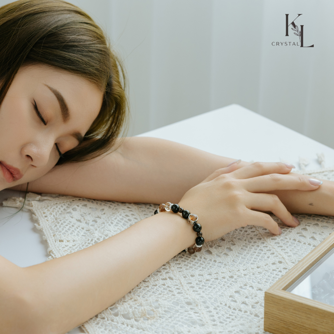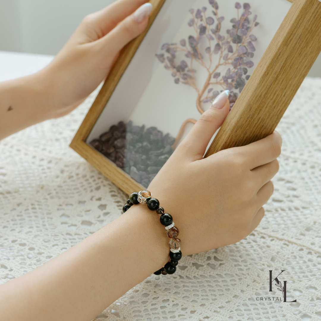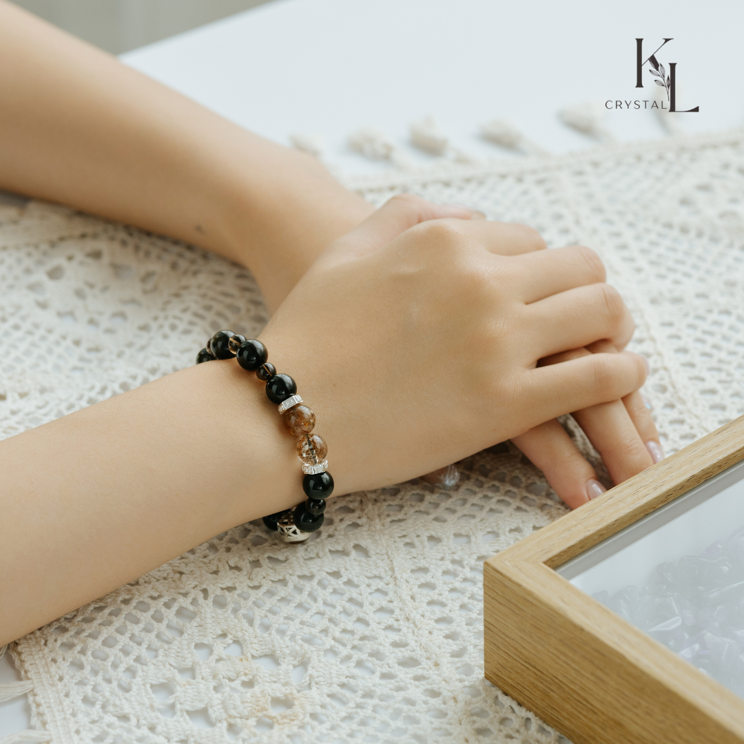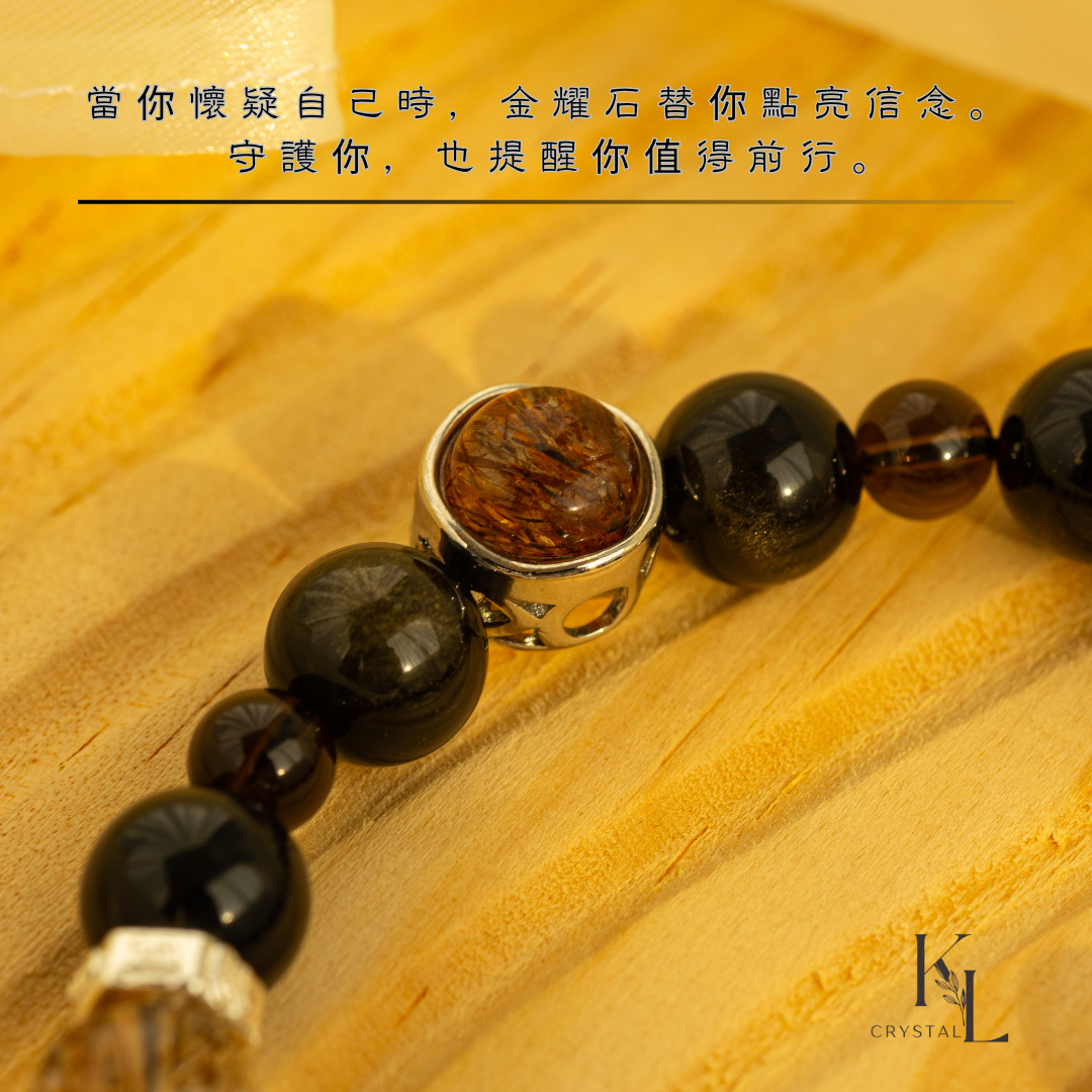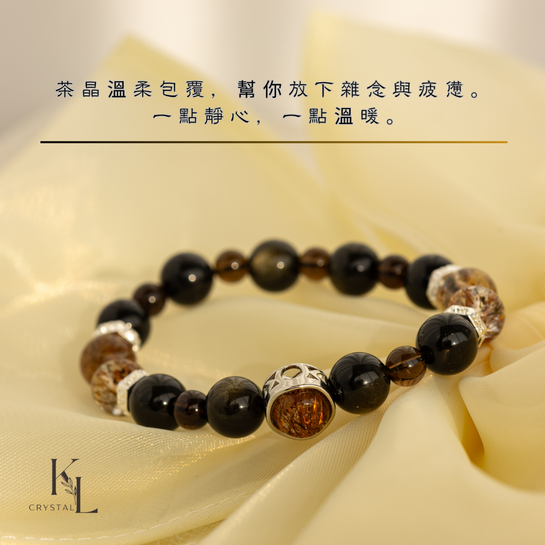茶晶如同夜晚的霧,溫柔包覆著焦躁的思緒。它在手鍊中扮演過渡與連結的角色,串接起主石與金耀石,打造出整體和諧的能量場。